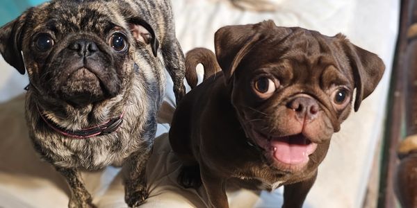 This is Juno, the brindle Pug on the left and Daddy CoCo is the Chocolate Pug on the right. She had her babies on Jan.2, 2026 at 11AM. She is a fantastic mamma. Both are AKC and from Champion bloodlines. They will be able to go home around the Feb 28th.